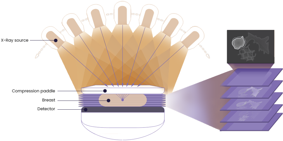 The X-ray tube rotates around the breast and takes high-definition, high-resolution images with high contrast from various angles.
